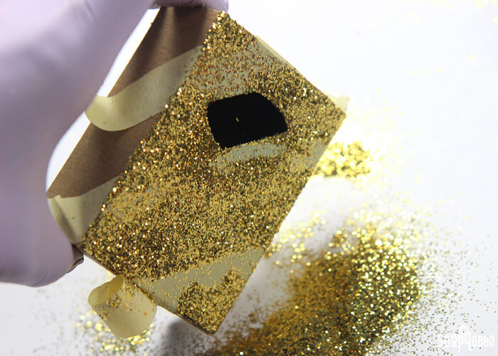 - While the glue is still wet, sprinkle the box with glitter making sure all the areas with glue are covered. Use your fingers to lightly press and spread the glitter on to the box.