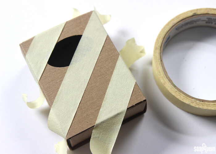 - Lightly place painters tape on the front of the soap box in a diagonal pattern. Keep in mind that the area where the tape lays will not have glitter on it. Try your best to space them tape out evenly. Don’t press the tape on the box too firmly; because the box is cardboard the tape can peel away the box.