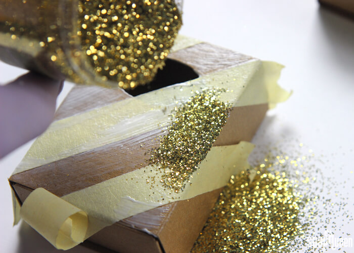 Super easy to make, all you need for this project is some glitter, glue, tape and soap boxes! Simply lay down tape, brush on glue and sprinkle on plenty of glitter. We used Gold Nail Polish Glitter, but these boxes would also look great with Silver Nail Polish or Iridescent Glitter as well. If you’re looking for more packaging inspiration, check out my Packaging Inspiration Pinterest Board.