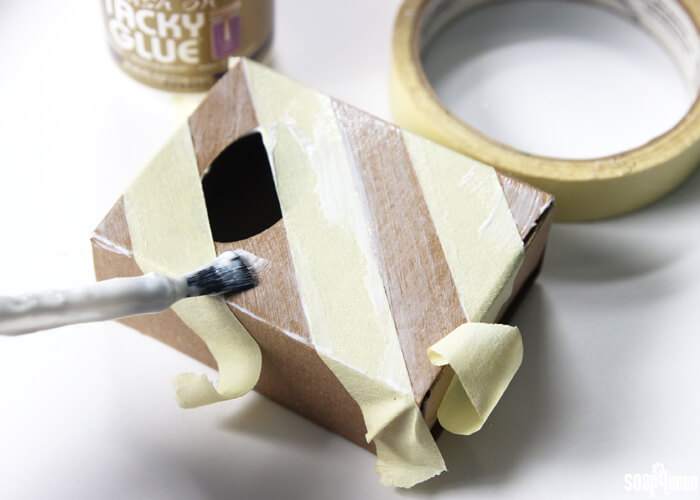 - Brush glue on the areas of the box uncovered by tape. Just a light coating of glue will work! We used Tacky Glue, but you could also use Elemer’s Glue or Modge Podge.
