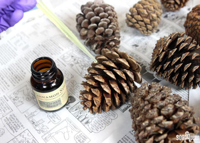 - Allow the pine cones to cool completely. Using a dropper, drop 3-5 mL of fragrance or essential oil onto each pine cone. Drop the scent in different areas to help evenly distribute the fragrance. I recommend placing newspaper on your work surface to help absorb any fragrance or essential oil that drips off the pine cones. Fragrance and essential oils will eat through plastic, so be sure to protect your work space accordingly. In addition, make sure you’re wearing gloves. Undiluted fragrance and essential oils can irritate the skin.