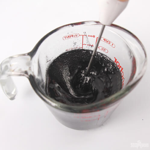 TWO: Add the entirety of the colorant to the melted olive oil and wax mixture. We used a mini mixer to incorporate the color.