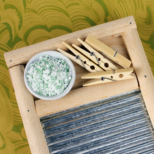 We’ve just welcomed Bramble Berry’s latest product, Washing Soda. It was perfect timing for this project! Otherwise known as Sodium Carbonate or Soda Ash, Washing Soda is a common base ingredient in many laundry soaps. In addition to acting as a water softener, Washing Soda is a stain remover and can even work as a fixative for some natural dyeing techniques.