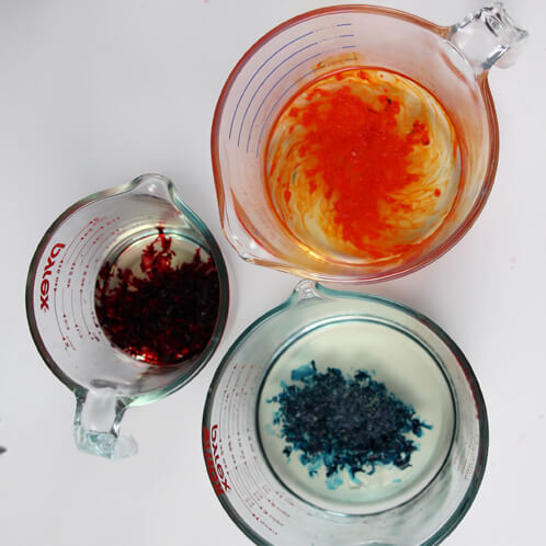 FOUR: Now you can add in the red, teal and orange color block shavings you set aside earlier. Pour one color per container.