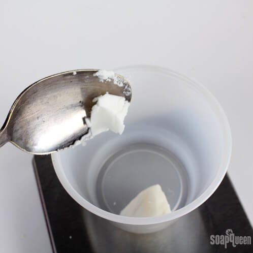 TWO: Add the Shea Butter, Fractionated Coconut Oil, Isopropyl Myristate and Vitamin E Oil. Stir until the Shea Butter has fully melted (or help it along in the microwave for 10-15 seconds. Make sure you microwave in a microwave-safe dish! You wouldn’t put this little plastic container (below) in the microwave — it would melt!).