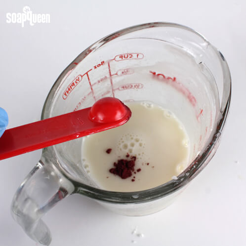 As for color, it will take a little bit of testing to get your perfect shade. I would recommend using 1 mini scoop of Titanium Dioxide and 2 mini scoops of Burgundy Oxide to start out with. Then, dip a frozen spoon in the mixture to check the color. You can see how to do that trick in the Spoon Trick post: https://soapqueen.com/bath-and-body-tutorials/tips-and-tricks/spoon-trick/
