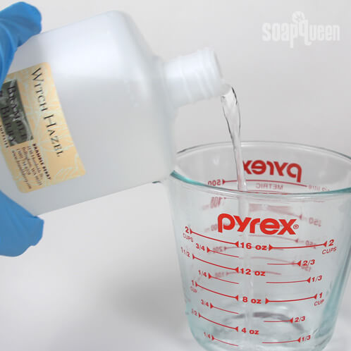 ONE:Â Begin by pouring 1 cup of witch hazel into a sanitized (a quick dip in 5% bleach water will take care of that for you) measuring cup.
