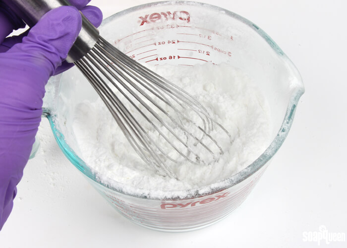 • In a mixing bowl, add the baking soda and washing soda. Washing soda can cause skin irritation, so we recommend wearing gloves and long sleeves when working with it. It can also irritate the nose and throat, so you can wear a mask if you like. If necessary, sift the baking soda through a fine mesh strainer to remove any clumps.