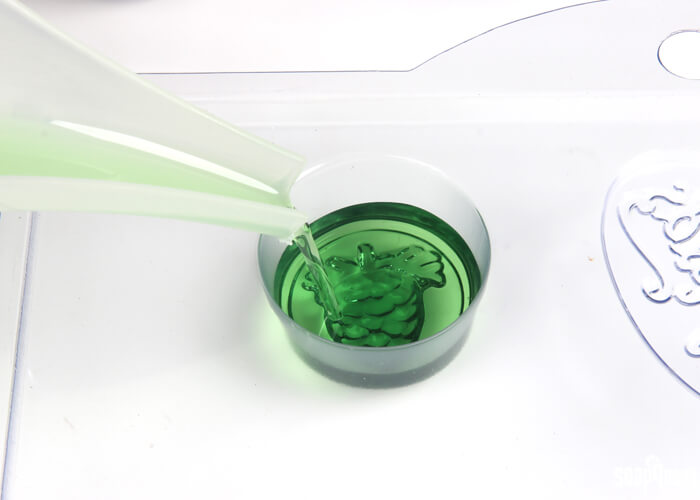 • Pour the green wax into the Pine Cone Wax Tart Mold. Set both molds aside and let fully cool and harden. This will take several hours.