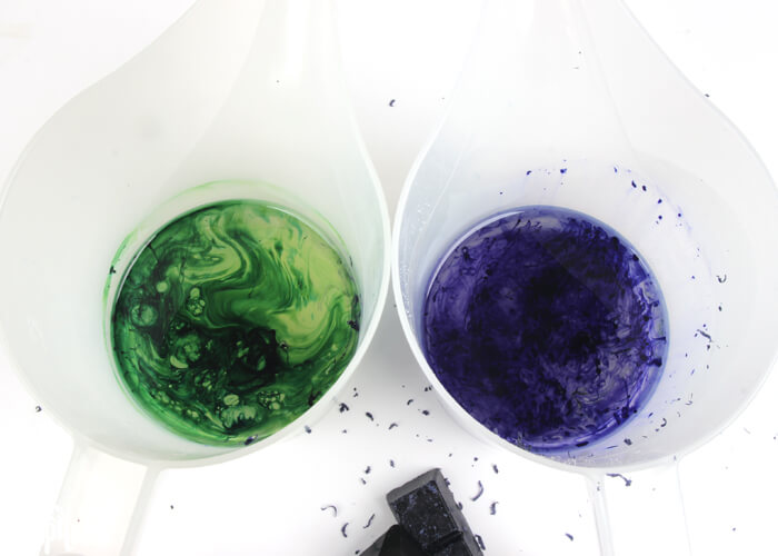 • To the other container, add shavings of the Hunter Green Wax Dye Block and stir with a spoon to fully incorporate. Test the color with another cold spoon. If necessary, add more shavings until a green color is achieved.