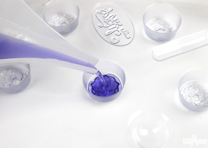 • Let the wax cool to around 140 ° F so it doesn’t warp the plastic mold. Pour the purple wax into the Lotus Blossom Mold.