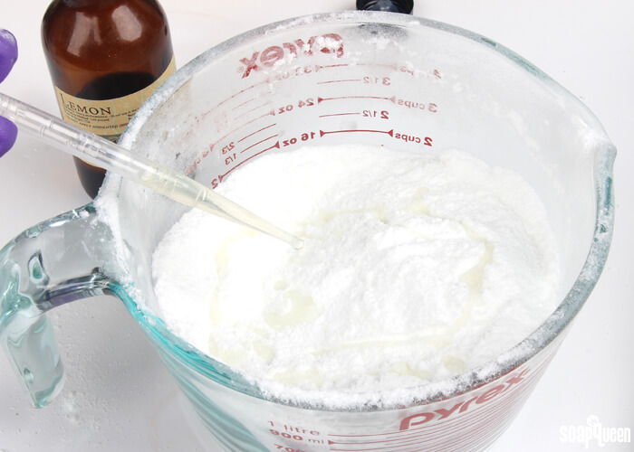 THREE: Add the lemon and lavender essential oils and use a whisk or your hands to thoroughly mix the oils into the dry powders. Make sure to blend well! You don’t want any oil chunks in the mixture that could transfer to your carpet.