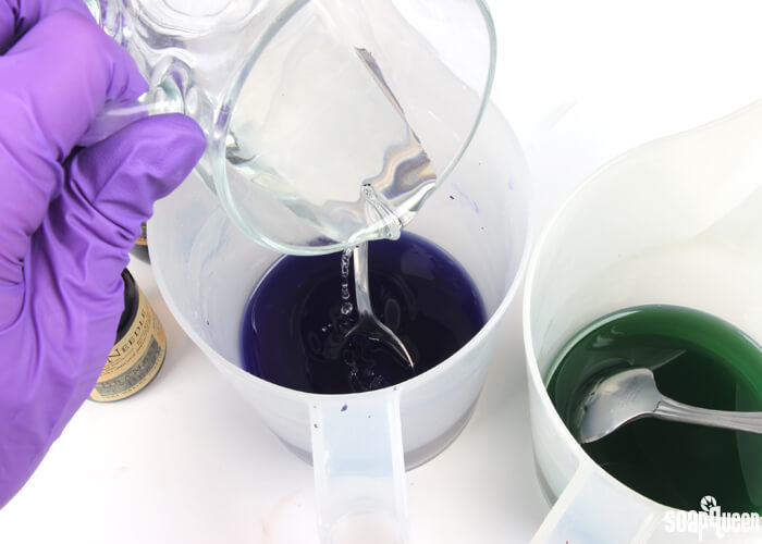 • To the green container, add the fir needle essential oil. To the purple container, add the lavender 40/42 essential oil. Stir both containers to fully combine the essential oil.