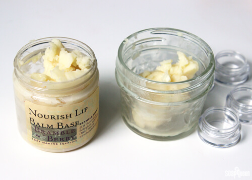 - In a small heat safe container, melt 1 oz. of the Nourish Lip Balm Base in the microwave using 20 second bursts.