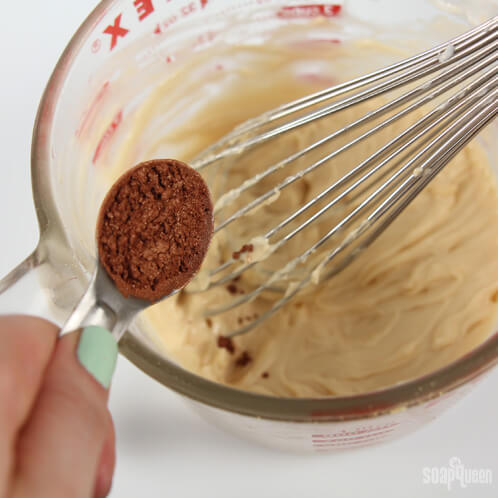 TWO: Mix in the gold sparkle mica, bronze mica and 5 mL Burnt Sugar Fragrance Oil. Stir until thoroughly mixed in. We found using a whisk worked just fine, but you could also use a hand or stand mixer.