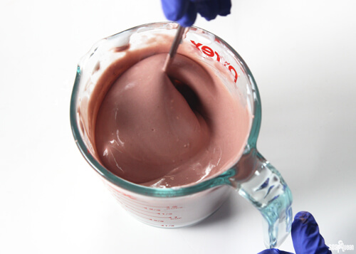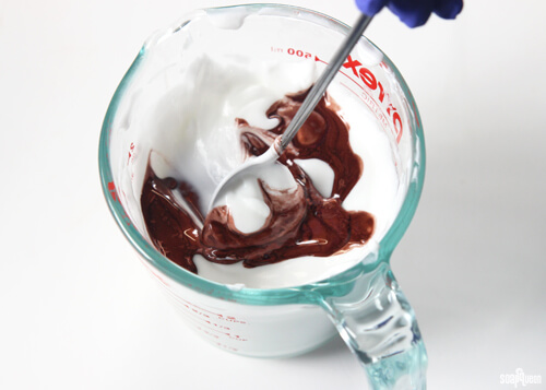 • Add the colored fragrance oil to the warm lotion, and stir to combine.