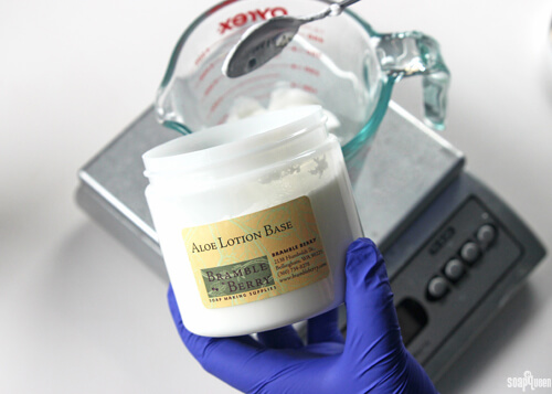 • Scoop the Aloe Lotion into the disinfected container, and heat in the microwave in 10 second bursts, stirring between each heating burst. Be very careful to not heat the lotion above 115°F, or the preservative can become ineffective. The lotion should become slightly more liquid and pourable.
