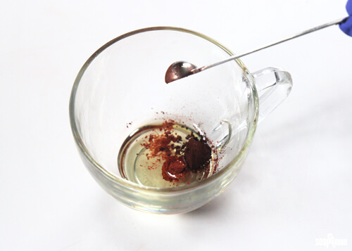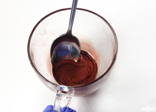 • In a seperate container, measure out 4.5ml (about 0.15 oz) of Burnt Sugar Fragrance Oil. Add 1/8 tsp Cappuccino Mica, and 1 tsp Lip Safe Copper Shimmer Mica to the fragrance oil, and stir well.