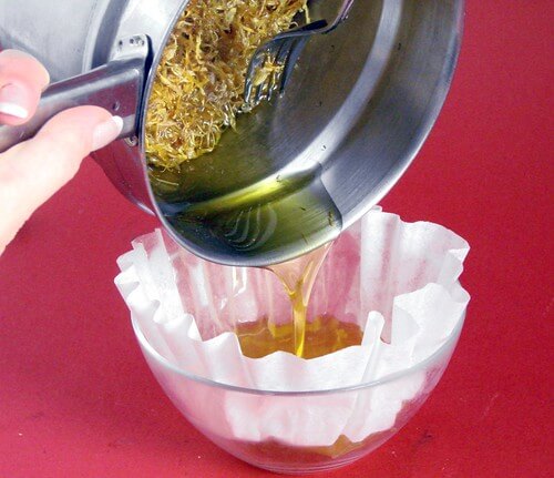 - Strain Calendula Oil through a cheesecloth or coffee filter. It will be a little cloudy. It’s practically impossible to strain every teensy little bit of herb out.