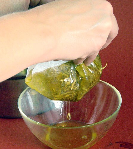 I like this article. It’s easier for me to wear plastic disposable gloves while wringing out the infused oil with a cheese clothes. Catches everything. Once I’m finished, I remove the gloves and roll the cheesecloth inside the gloves. Done. Easy cleanup. No mess.