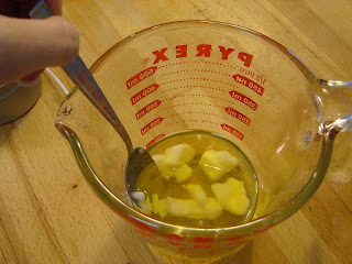 THREE: Once fully melted, add the Shea Butter to the heated oils and wax. Hint: smaller chunks of Shea Butter melt more quickly than one big chunk.