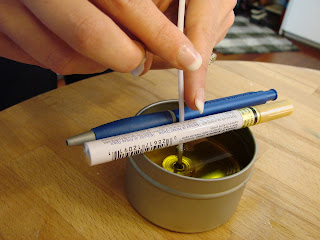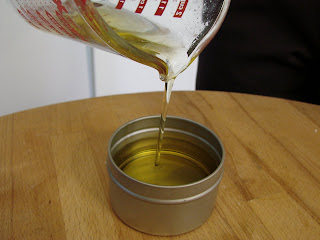 Pour the Wax Oil combination and center the wick. The wick has a tendency to flop over. You can easily prop up the wick in between two pens or chopstick.