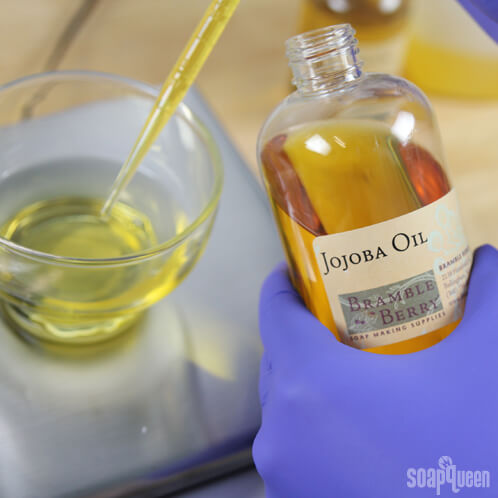 THREE: Add the Jojoba Oil. Because it’s such a small amount, we used a dropper to add it to the mixture.