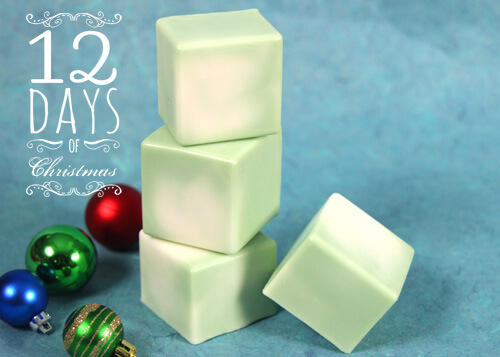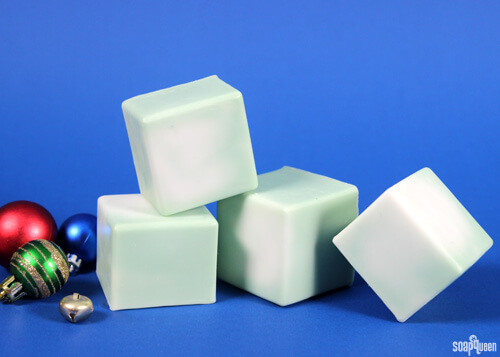 These melt and pour cubes are made with the creamy and delicious Cream Cheese Frosting Fragrance Oil. Colored with Emerald Green LabColor, these soaps are wonderfully festive and cheery. Don’t forget to add the Vanilla Color Stabilizer, otherwise the Cream Cheese Frosting Fragrance Oil will discolor the soap a deep brown.
