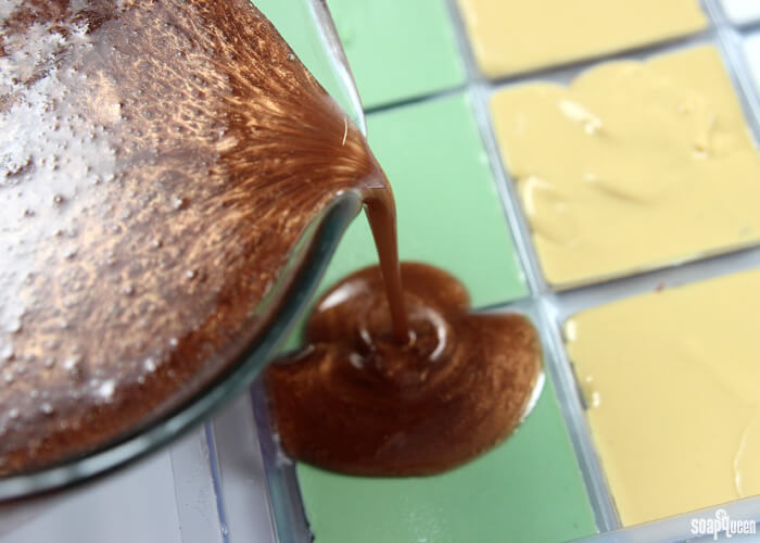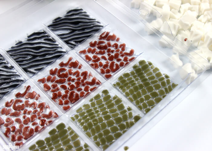 • Repeat this process with the leopard and animal squares. For the alligator print, add shavings of the Chrome Green Oxide to achieve a light green color. For the leopard squares, add shavings of the Yellow Oxide Color Block to achieve a light yellow color. Before pouring each layer, don’t forget to spray with alcohol to help them adhere. Also, be sure to allow the soap to cool to 130 ° or below so it does not melt and small details. Allow all the cavities to cool and harden completely.