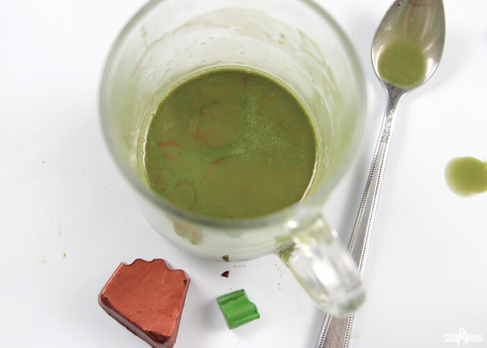 • Chop and melt 2 oz. of the ClearMelt and Pour base in the microwave using 10 second bursts. Using very short bursts will help prevent burning such a small amount of melt and pour. Once melted, add shavings of the Chrome Green Color Block and shavings of the Shimmer Cappuccino Color Block. We used about twice the amount of the green color block to achieve the color below. Once you have developed a deep earthy green, spray the mold with rubbing alcohol. Use the droppers to fill in the alligator print. Spritz while filling in the stripes to help break apart any bubbles.