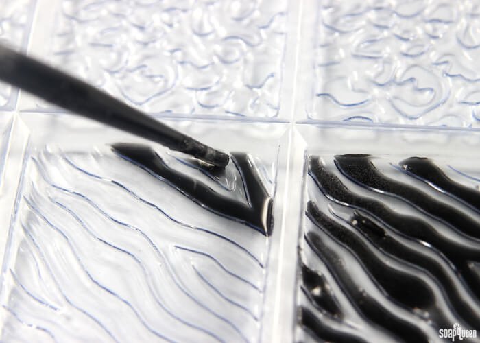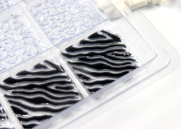 • Chop and melt 2 oz. of the Clear Melt and Pour base in the microwave using 10 second bursts. Using very short bursts will help prevent burning such a small amount of melt and pour. Once melted, add shavings of the Black Oxide Color Block until you achieve a rich black color. Spray the mold with rubbing alcohol, and use the droppers to fill in the zebra stripes. Spritz while filling in the stripes to help break apart any bubbles.