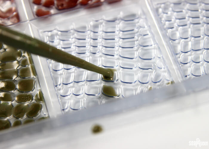 Chop and melt 2 oz. of the Clear Melt and Pour base in the microwave using 10 second bursts. Using very short bursts will help prevent burning such a small amount of melt and pour. Once melted, add shavings of the Chrome Green Color Block and shavings of the Shimmer Cappuccino Color Block. We used about twice the amount of the green color block to achieve the color below. Once you have developed a deep earthy green, spray the mold with rubbing alcohol. Use the droppers to fill in the alligator print. Spritz while filling in the stripes to help break apart any bubbles.