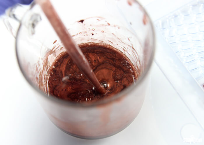Once the cavities have melted, chop and melt 30 ounces of Clear Melt and Pour Base in the microwave using 30 second bursts. Stir in between each burst to help the soap melt evenly. Add shavings of the Gold Sparkle Color Block and Shimmer Cappuccino Color Block until you achieve a rich, sparkly copper color. Add the Sandalwood Vanilla Fragrance Oil and Vanilla Color Stabilizer and stir to fully combine. Adding Vanilla Color Stabilizer helps keep the soap a lighter brown color. Learn more in the Why Did My Soap Turn Brown post. Once the soap has reached 130 ° or below, spray the bottom layer with rubbing alcohol. Gently pour the melted soap into the mold, and spritz with alcohol to disperse any bubbles. Allow to fully cool and harden.