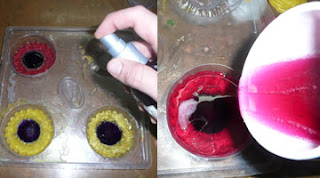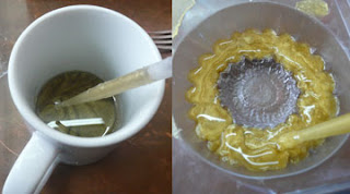 Step Two: Color your melted soap base with the Sunflower Labcolor and pour into the petals part of your mold. Don’t forget to spritz each layer with alcohol to eliminate bubbles and to make sure your layers stick together.