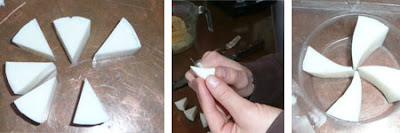 Step 5: With a very small bladed knife make a mark in the center of the circle.Proceed to cut the round soap into eight sections using the mark as a starting point on each cut.You get extra bonus points if you cut the sections curved. It’s harder than it looks to cut them curved!Out of the eight sections, pick the four that align with each other the best.