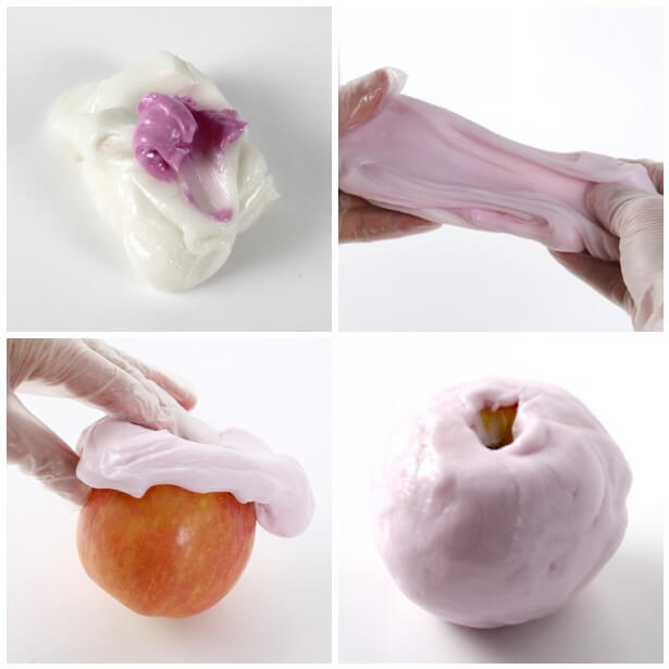 Molding the Apple: Carefully form the putty around your Apple. Really press the putty into the apple to ensure that you get all of the realistic details and to release any air bubbles. Make sure there are no holes in the putty that the soap could potentially leak through. Leave a really small hole at the top of the apple. We’ll trim the top up later so it doesn’t have to be pretty. While the putty is pliable, you have about a minute to work so work fast. Once fully formed, let the mold dry for about 30 minutes.