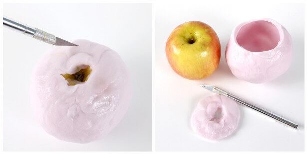 Trim the Mold: When the putty seems to be dry, cut off the top of your mold with a craft knife (which will be the base of your apple). Having a clean cut line will prevent tearing when unmolding your apple.
