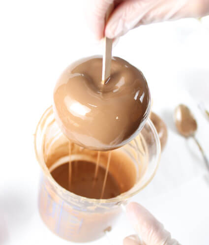 FOUR: You should have about a cup of  caramel colored soap left over (give or take depending on the size of your apple). Melt that back down and let it cool to about 140 degrees. Then dip your apple soap into the melted caramel colored soap just like you’re making a real caramel apple.