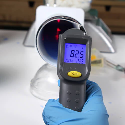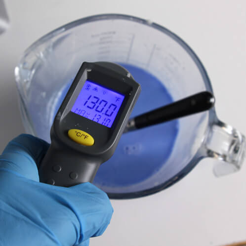 SEVEN: It’s very important to not rotate the mold until the soap is solid. Otherwise, you could risk breaking through the top skin and spilling soap around the inside of the mold. Wait at least two hours for the soap to harden, and then using a temperature gun, take the temperature of the soap in the back of the mold. I waited until my first layer was around 82 degrees at the soap’s deepest point just to be sure.