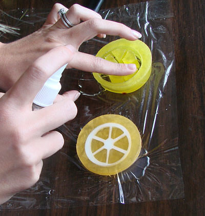 2. Spritz the “rind” and inside of the rind (onto the plastic wrap) with rubbing alcohol. Pour a thin layer of clear soap into the rind.