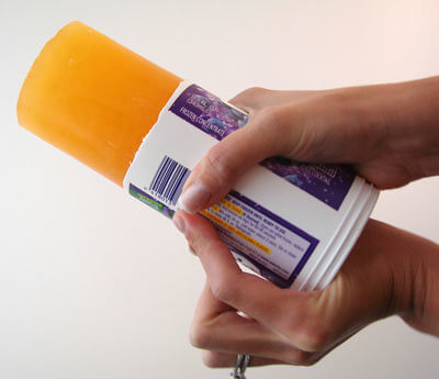 Tip: When using a plastic juice can, be sure to cut the bottom off before you fill it with soap. They’re much harder to saw through with a dull kitchen knife otherwise.