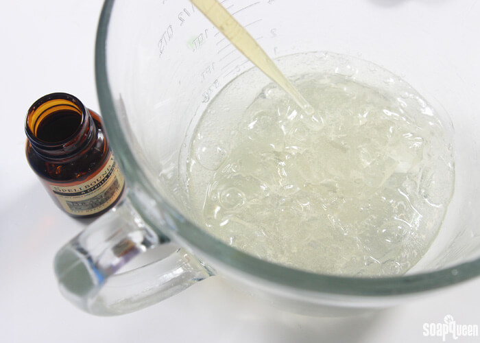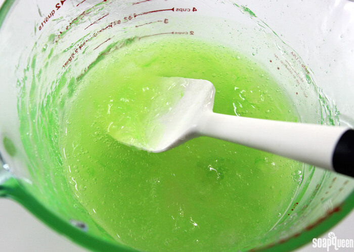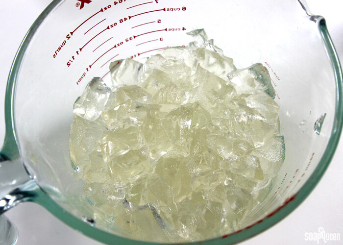 - Cut the Stephenson Jelly Melt and Pour into small pieces. Place in a large heat safe container and melt using 1 minute bursts. This melt and pour base takes a little longer to melt than regular melt and pour soap, so longer bursts are needed. Keep stirring between each burst but only a few times; jelly soap has a tendency to create bubbles. Because the soap base is so thick, the bubbles do not rise to the top like regular melt and pour bases. Once melted, remove from the microwave. The base will be thick. Split the soap into two even containers.