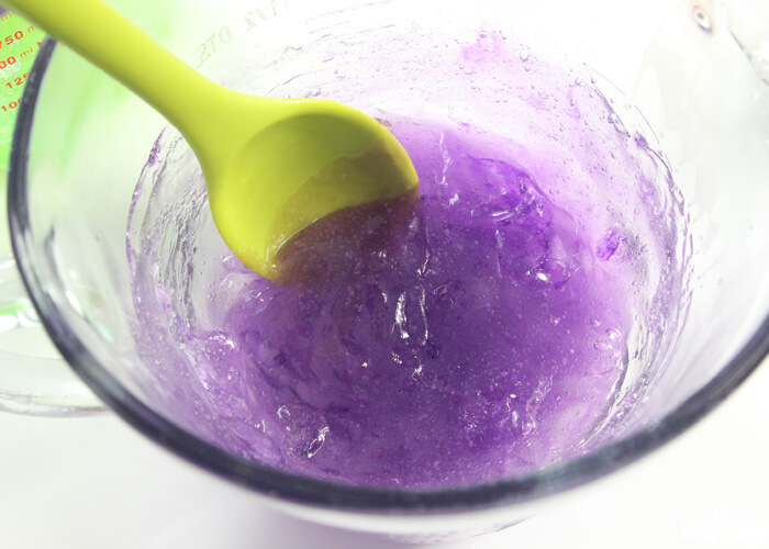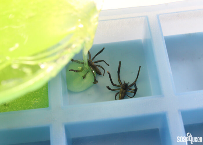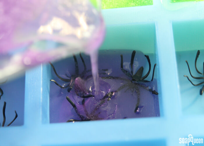 - Place two to three spider toys face down in the mold. Spritz with rubbing alcohol to help the spiders stay in the soap and slowly pour the green and purple soap into the molds. We found this recipe comfortably creates 3-4 soap jellies in each color. Because the soap is so thick, spraying the top with 99% isopropyl alcohol is not needed. The alcohol does not work very well to disperse bubbles. Allow the soap to fully cool and harden for several hours. Gently remove from the mold.