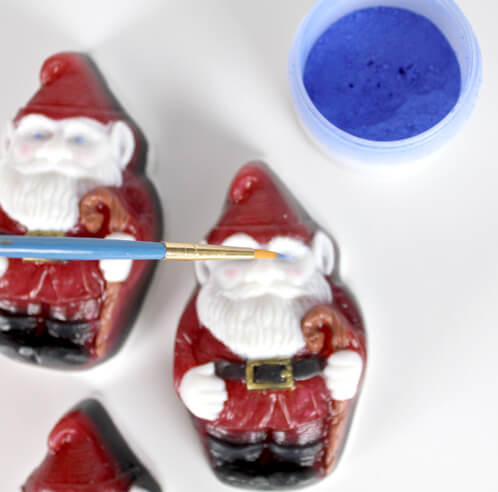Mica Brush Details: Use a fine paint bush to brush on the finer details of Santa. Use the 1982 Blue Mica for his sparkle blue eyes, the Red Blue Mica for his rosy cheeks and nose and the Heavy Metal Gold for his belt buckle.