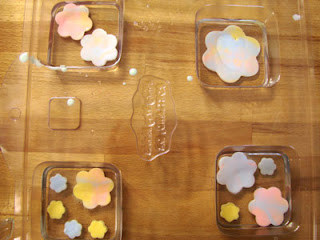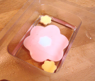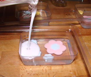 Step Five: You can pour clear soap over the back of the embedded daisies and have a clear, see-through bar. Or, you can wait for the clear soap to harden (about 10 minutes) and move onto Step Six.