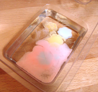 Step Three: Pour a thin layer of soap into the bottom of your basic shape mold. Make sure that the soap is not steaming. If you cannot easily put your finger in the soap without burning your finger, it’s not ready to be poured for embedding. This is what happens if you pour the clear soap too warm.