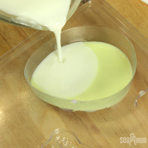 THREE: Stir to incorporate the colors into the melted base. Once the white soap in the mold had dried and the colored soap has cooled to around 130 degrees, spray the mold with isopropyl alcohol and then use the injector tool to fill in the small ring around the white soap. Spray with isopropyl alcohol to disperse bubbles and allow the soap the soap to dry for 15 – 20 minutes.