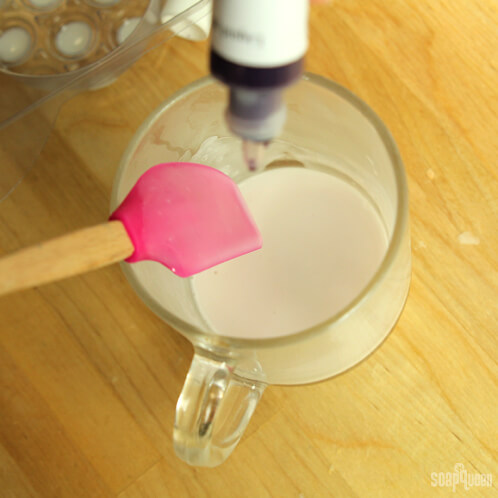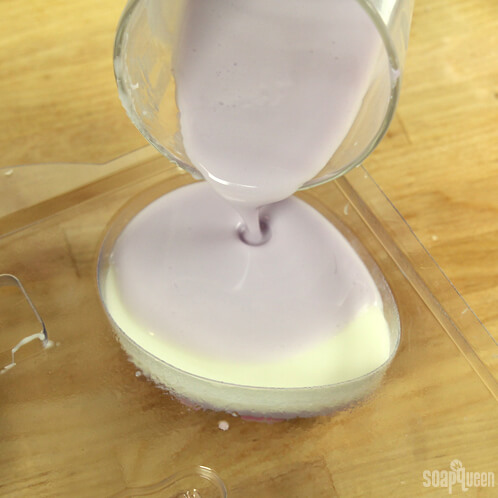 When the melted soap has cooled to 130 degrees or below, spray the mold with isopropyl alcohol and fill the cavity with the colored soap. Spray again with isopropyl alcohol to disperse bubbles.