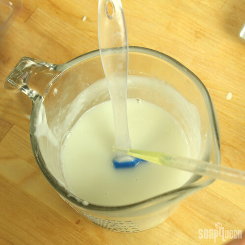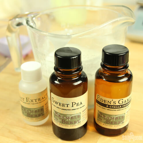 FIVE: Cut and melt 9 oz. of Goat Milk base and heat in the microwave on 10 second bursts. Leave this portion uncolored. Stir in 2 mL Eden’s Garden Cybilla Fragrance Oil, 1 mL Sweet Pea Fragrance Oil and 3 mL Oat Extract.