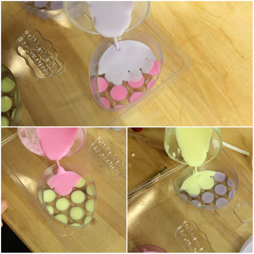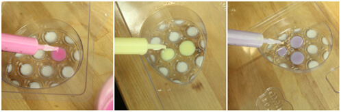 FOUR: By now your colored soap may have hardened, so give it a good stir and pop it into the microwave on 5 second bursts to remelt it if need be. When the melted soap has cooled to 130 degrees or below, spray the mold with isopropyl alcohol and pour a thin colored layer (about 1 centimeter) into the mold. You can choose whatever combination you’d like, but we poured purple over the pink dots, pink over the yellow dots and yellow over the purple dots.